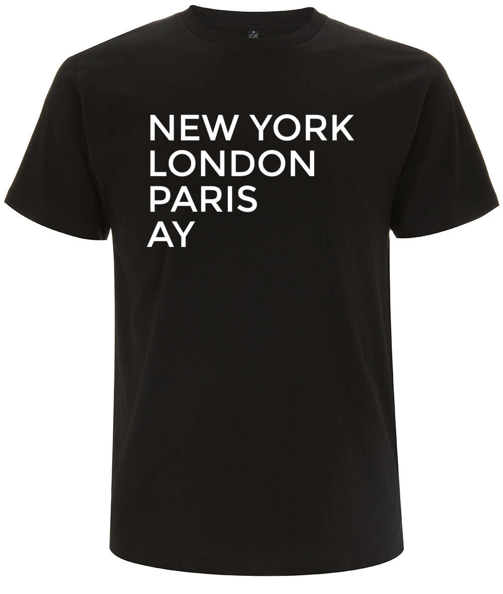 Lustiges Ay T-Shirt aus hochwertiger Bio-Baumwolle, bedruckt in Deutschland. Mit dem Ay T-Shirt zeigst du der Welt, dass Ay für dich in einer Reihe mit den wichtigsten Metropolen der Welt steht! Das Ay T-Shirt ist auch als Geschenk perfekt geeignet.