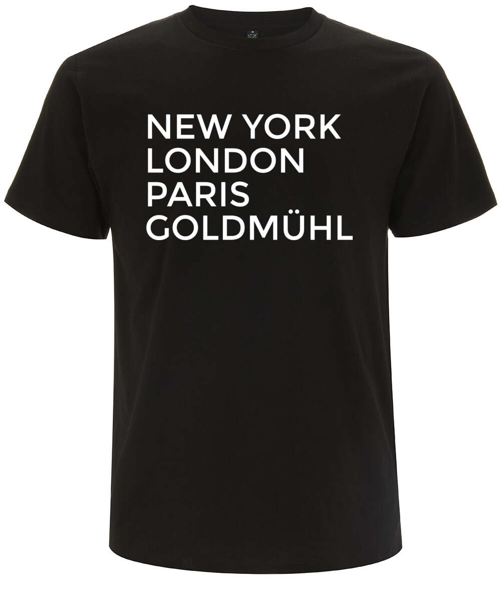 Lustiges Goldmühl T-Shirt aus hochwertiger Bio-Baumwolle, bedruckt in Deutschland. Mit dem Goldmühl T-Shirt zeigst du der Welt, dass Goldmühl für dich in einer Reihe mit den wichtigsten Metropolen der Welt steht! Das Goldmühl T-Shirt ist auch als Geschenk perfekt geeignet.