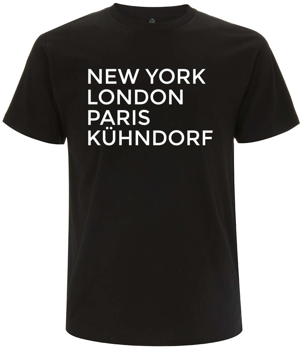 Aufschrift: New York – London – Paris – Kühndorf