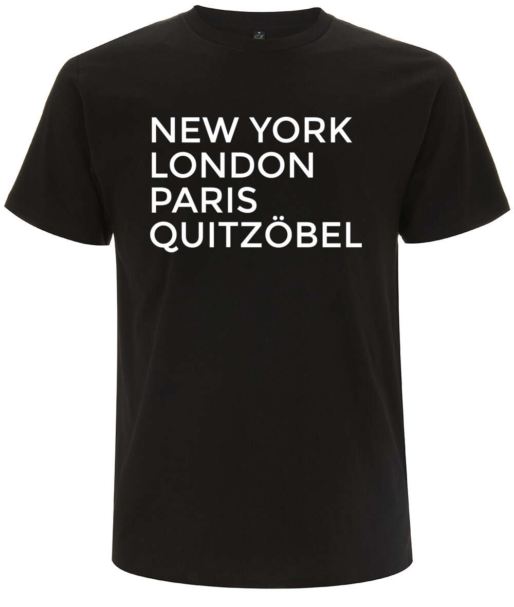 Lustiges Quitzöbel T-Shirt aus hochwertiger Bio-Baumwolle, bedruckt in Deutschland. Mit dem Quitzöbel T-Shirt zeigst du der Welt, dass Quitzöbel für dich in einer Reihe mit den wichtigsten Metropolen der Welt steht! Das Quitzöbel T-Shirt ist auch als Geschenk perfekt geeignet.